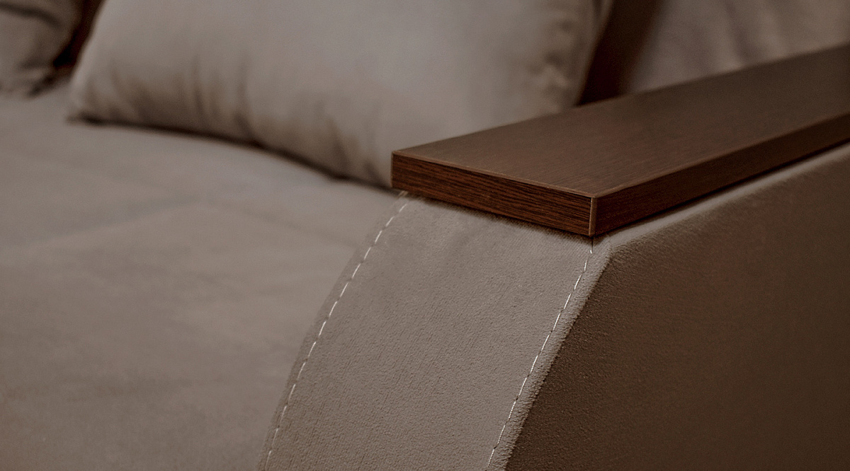 Деревянные накладки на подлокотниках заменят собой кофейный столик. На них можно поставить кружку, положить гаджеты, книги, крема. Сама вставка выполнена из ДСП, а её кромка - из ПВХ. Это препятствует расслоению и порче материала при его активном использовании и влажной уборке. Всё нужное с такими подлокотниками, всегда под рукой. Лишний раз вставать и идти за этими вещами не надо. Можно расслабиться.