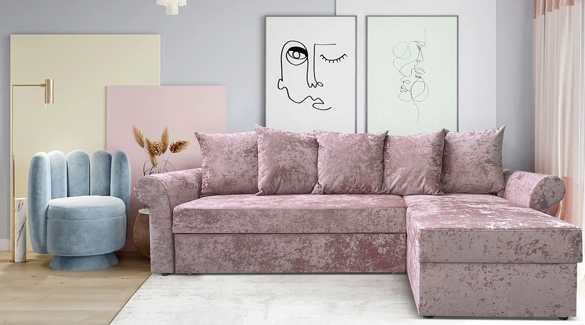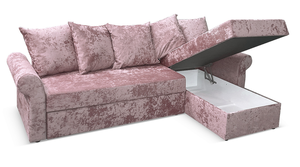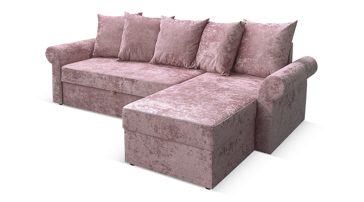 Бельевой короб, расположенный в оттоманке, позволяет бережно хранить спальные принадлежности или другие вещи. В зависимости от конструктивных особенностей пространства угол можно устанавливать как на левую, так и на правую сторону.