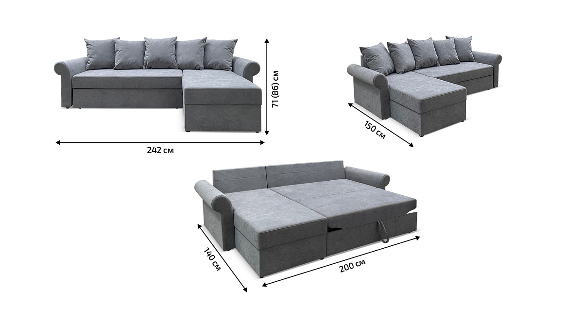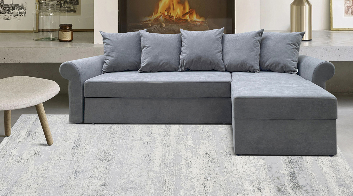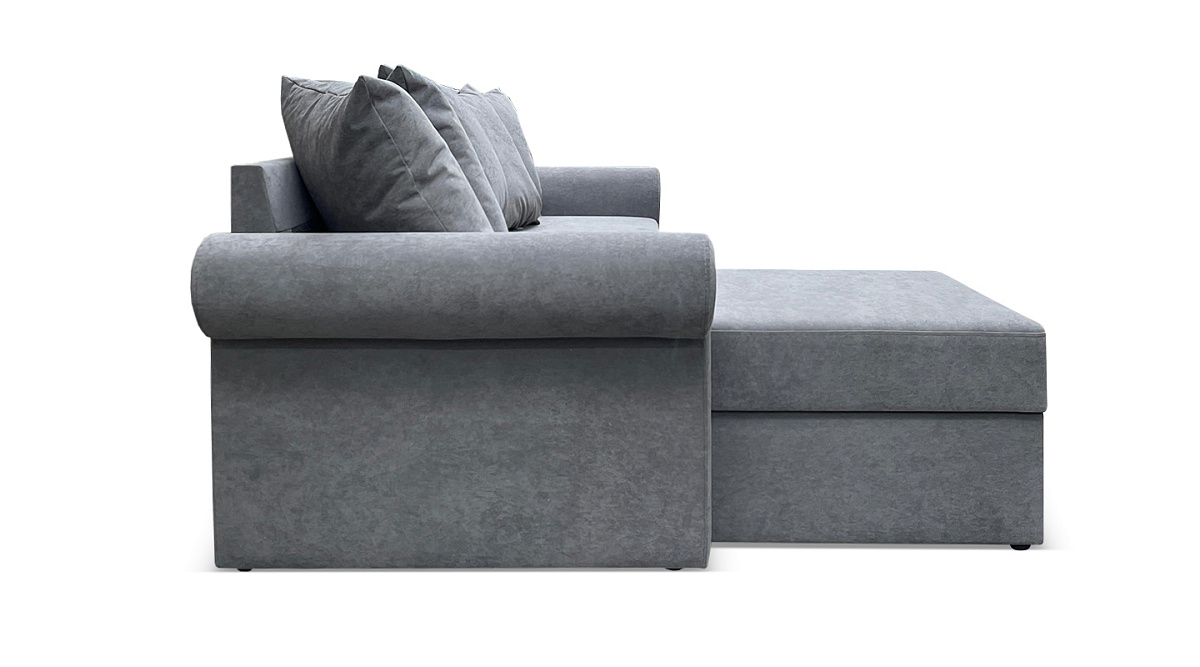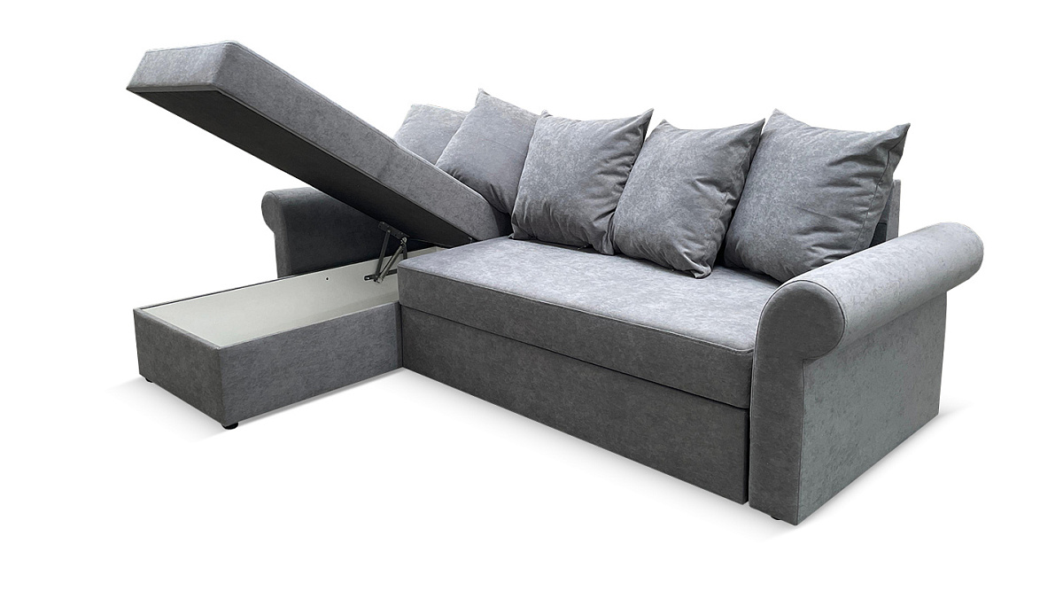 Бельевой короб, расположенный в оттоманке, позволяет бережно хранить спальные принадлежности или другие вещи. В зависимости от конструктивных особенностей пространства угол можно устанавливать как на левую, так и на правую сторону.