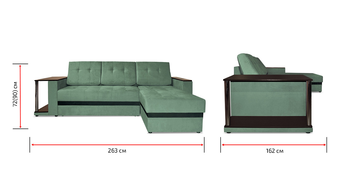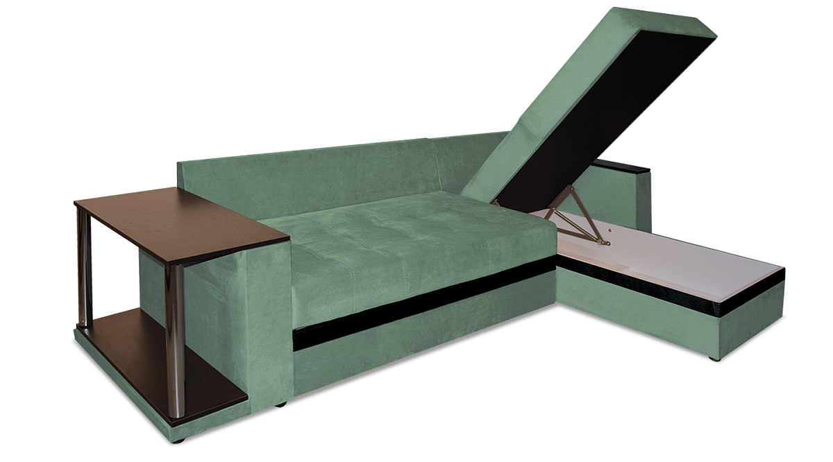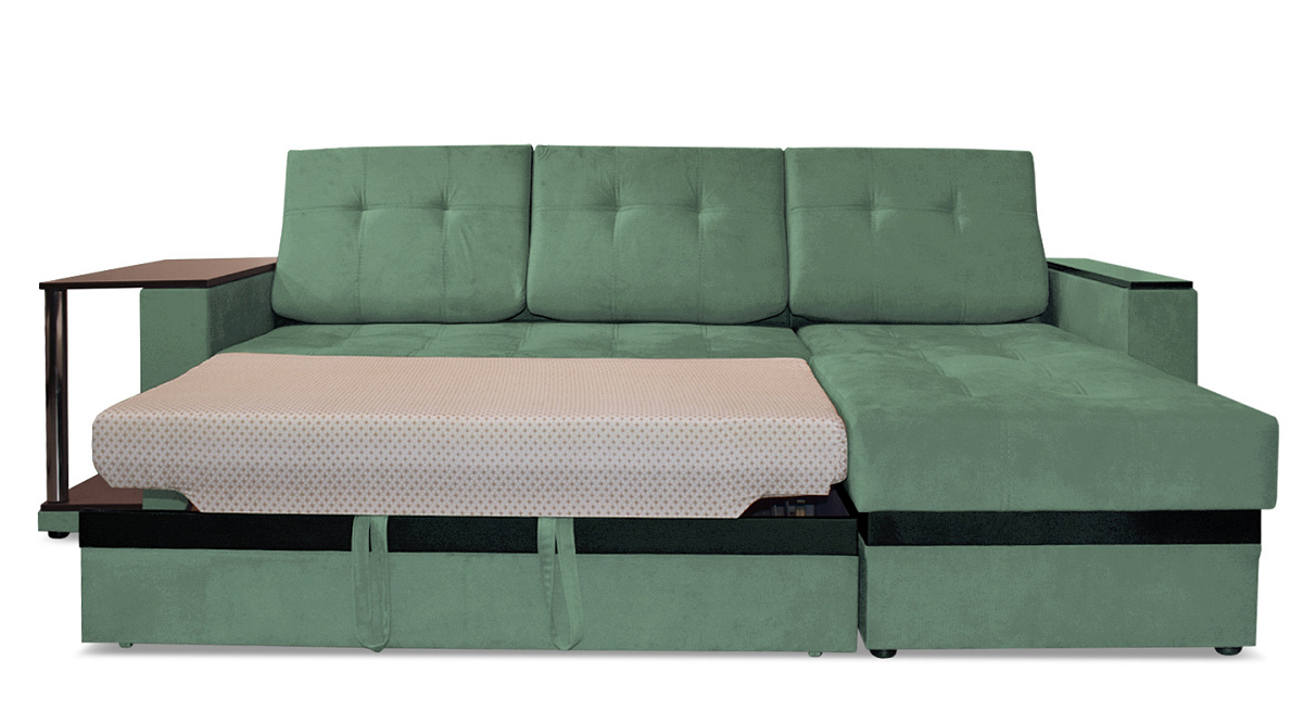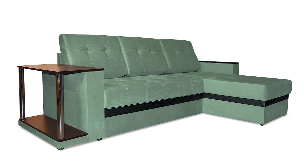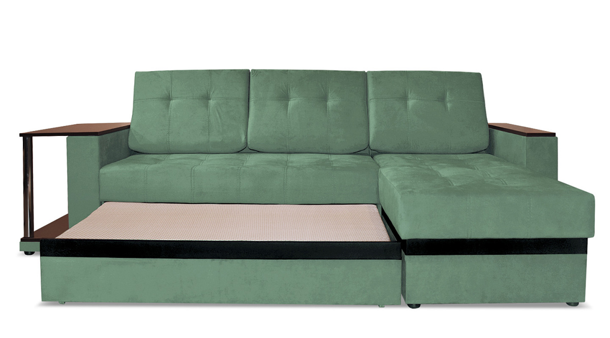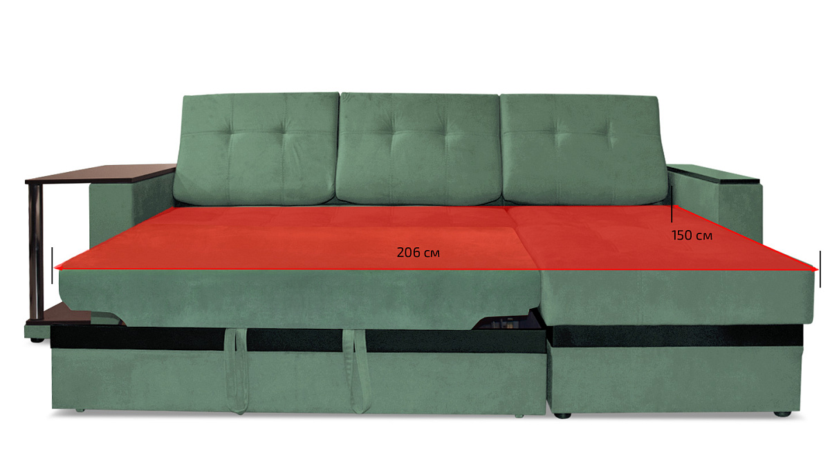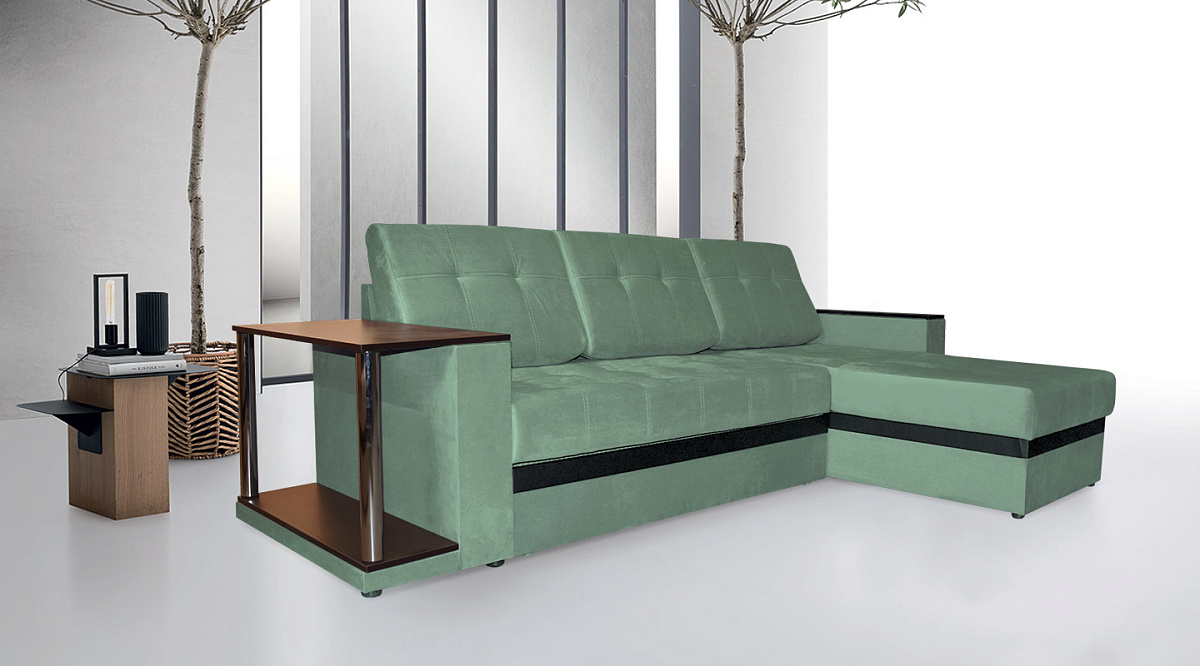 Диван легко раскладывается с помощью механизма трансформации “дельфин”. Получается абсолютно ровная поверхность без ямок и переходов по высоте - то есть полноценное спальное место, рассчитанное на двух человек. В основе наполнителя независимый пружинный блок и высококачественный ППУ. Украшают “Атланту” хромированные ножки встроенного столика.