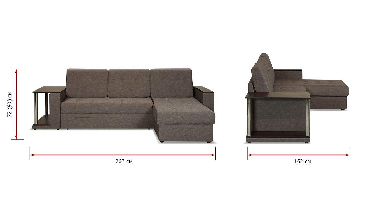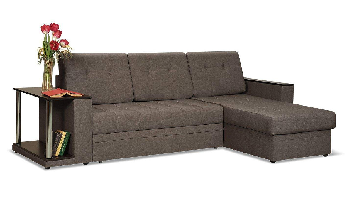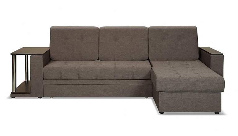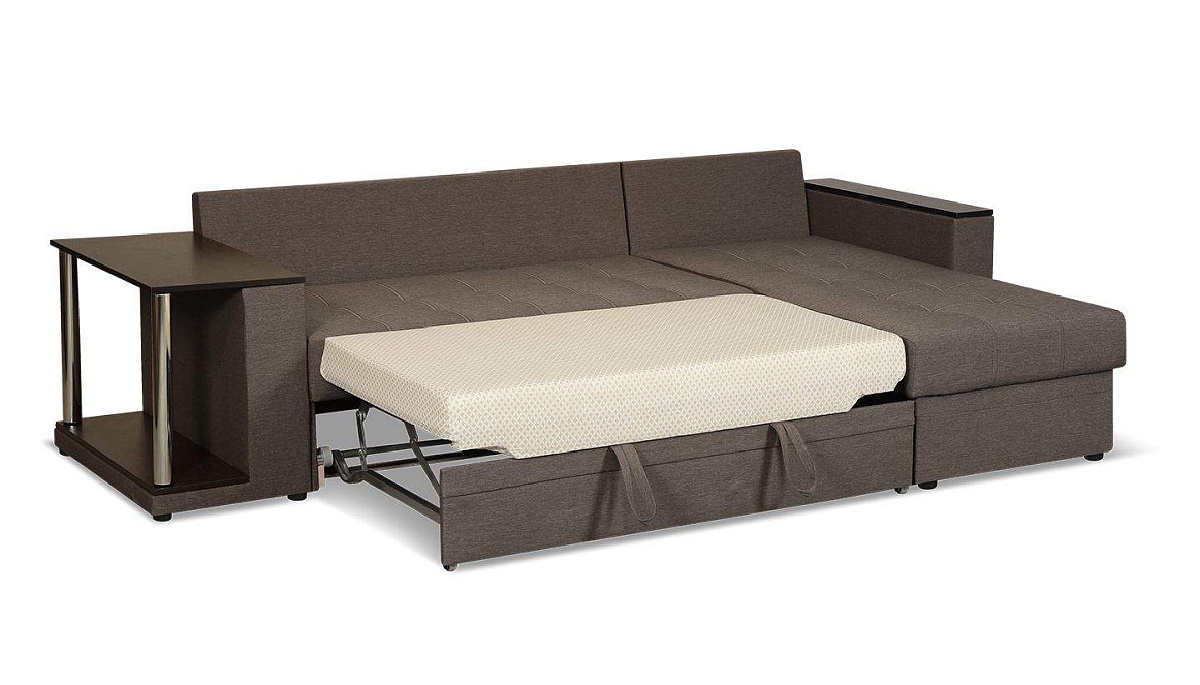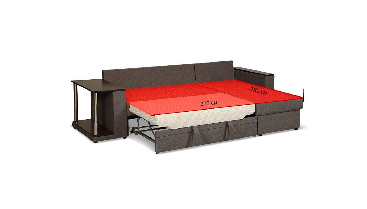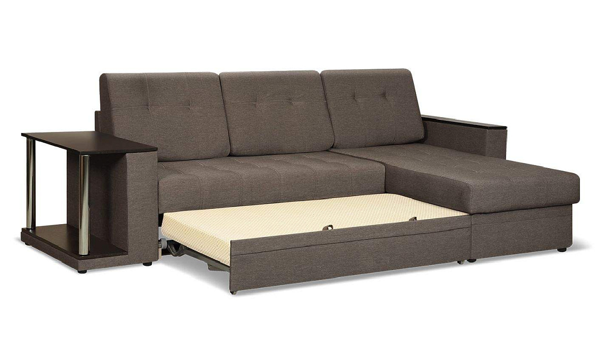 Диван легко раскладывается с помощью механизма трансформации “дельфин”. Получается абсолютно ровная поверхность без ямок и переходов по высоте - то есть полноценное спальное место, рассчитанное на двух человек. В основе наполнителя независимый пружинный блок и высококачественный ППУ. Украшают “Атланту” хромированные ножки встроенного столика.