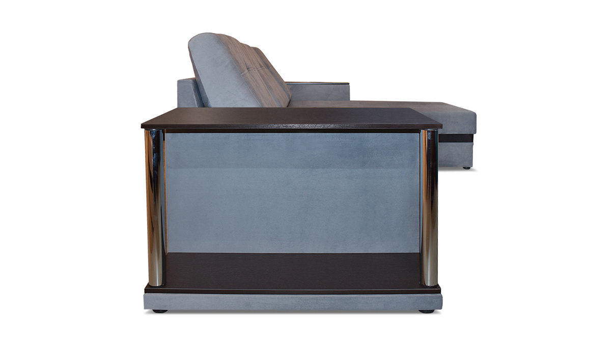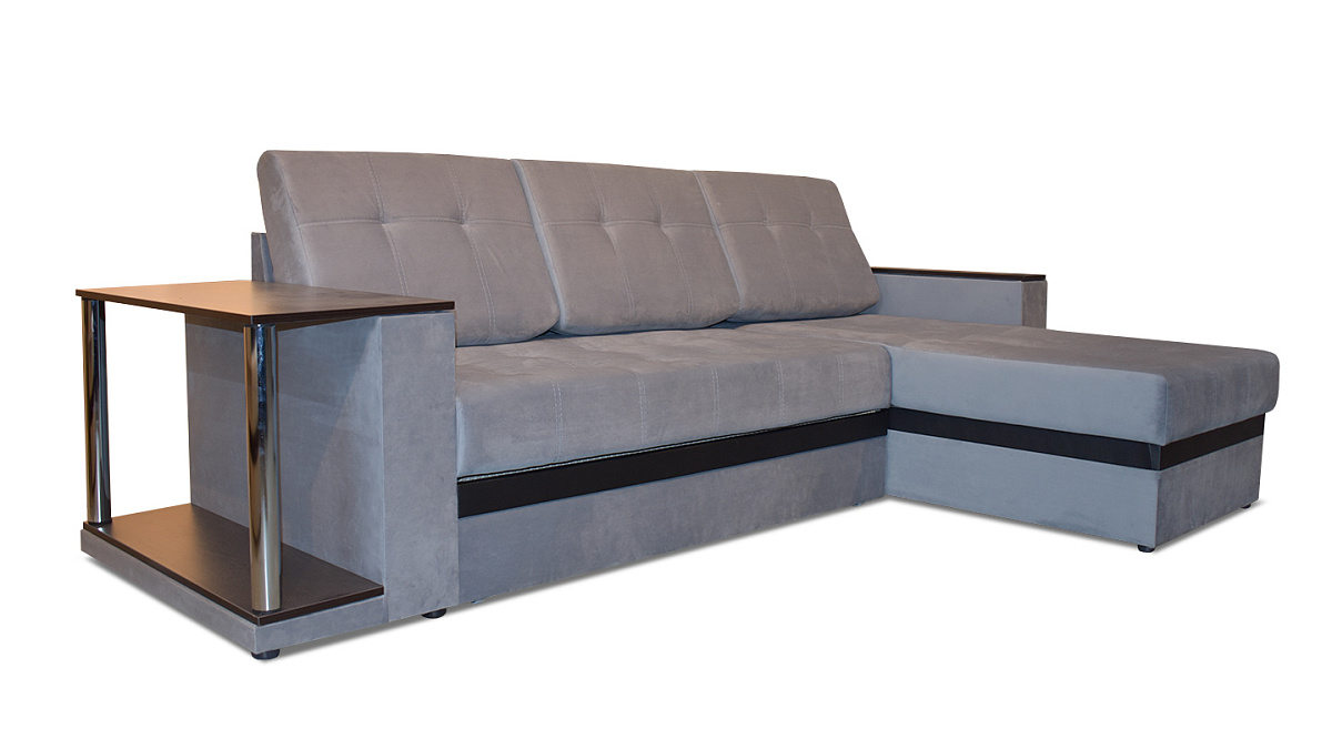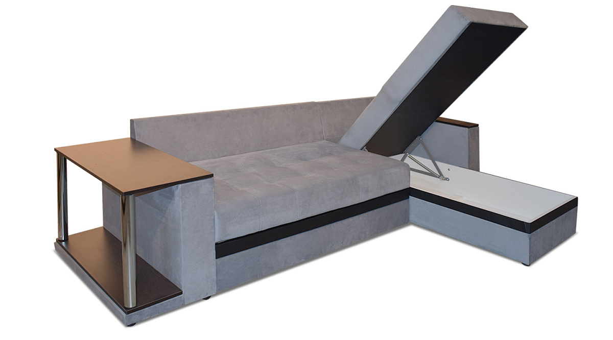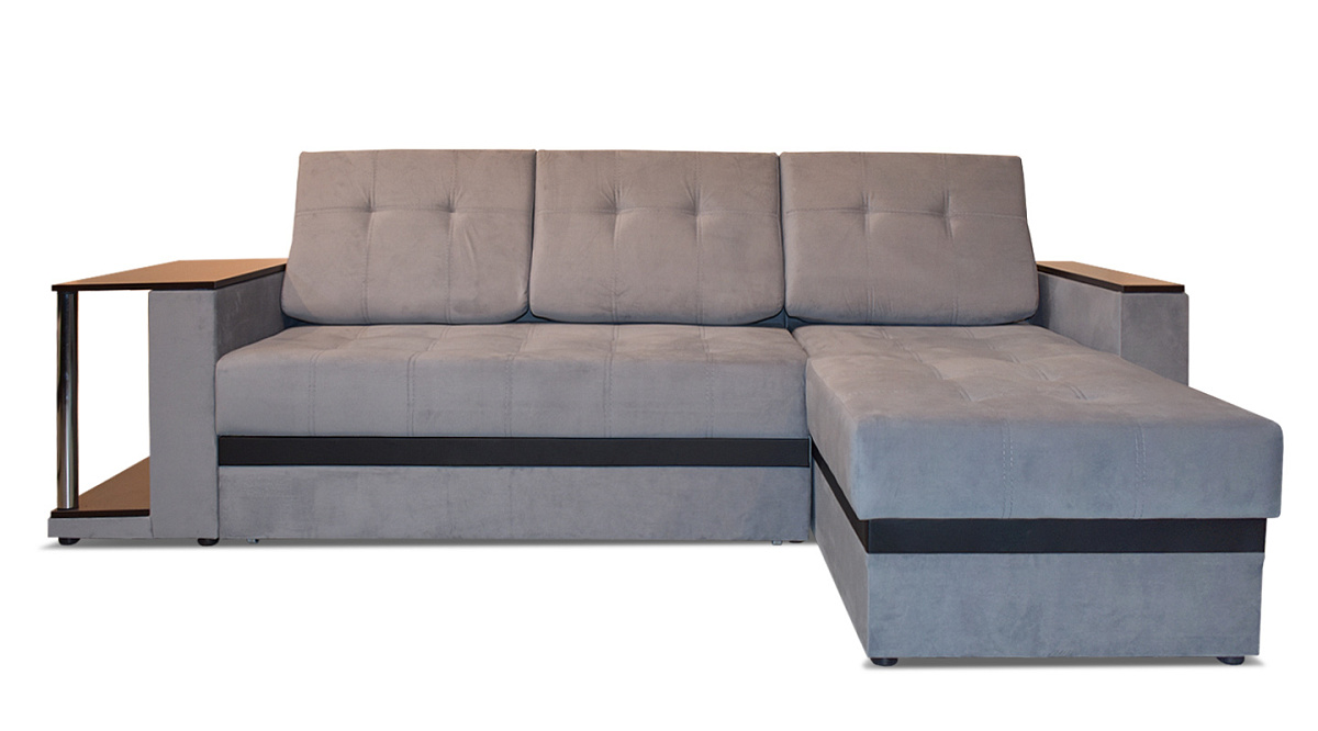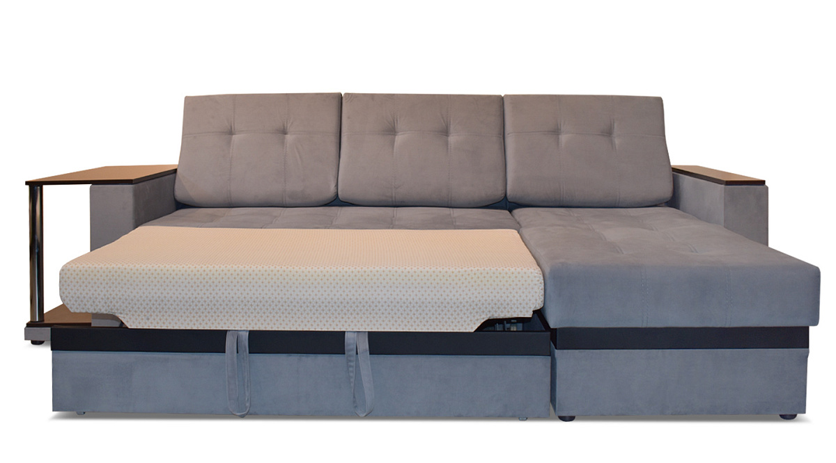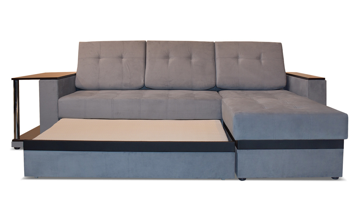 Диван легко раскладывается с помощью механизма трансформации “дельфин”. Получается абсолютно ровная поверхность без ямок и переходов по высоте - то есть полноценное спальное место, рассчитанное на двух человек. В основе наполнителя независимый пружинный блок и высококачественный ППУ. Украшают “Атланту” хромированные ножки встроенного столика.