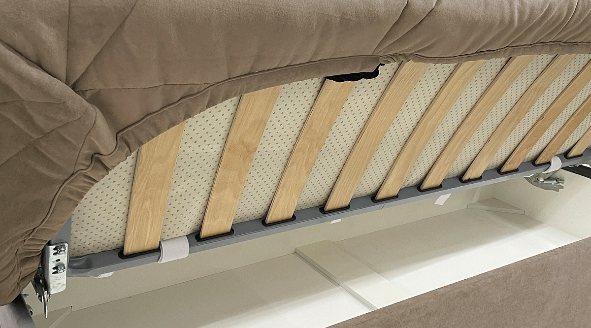Отсутствие подлокотников и наличие короба для постельного белья экономят пространство. В короб можно сложить сезонные вещи, постельные принадлежности и другие предметы - то есть шкафы и тумбочки для них уже не нужны. Вместо громоздких подлокотников - две декоративные подушки, на которые можно прилечь, положить под спину.