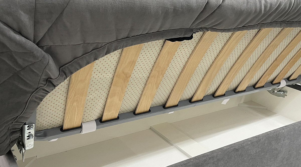 Отсутствие подлокотников и наличие короба для постельного белья экономят пространство. В короб можно сложить сезонные вещи, постельные принадлежности и другие предметы - то есть шкафы и тумбочки для них уже не нужны. Вместо громоздких подлокотников - две декоративные подушки, на которые можно прилечь, положить под спину.