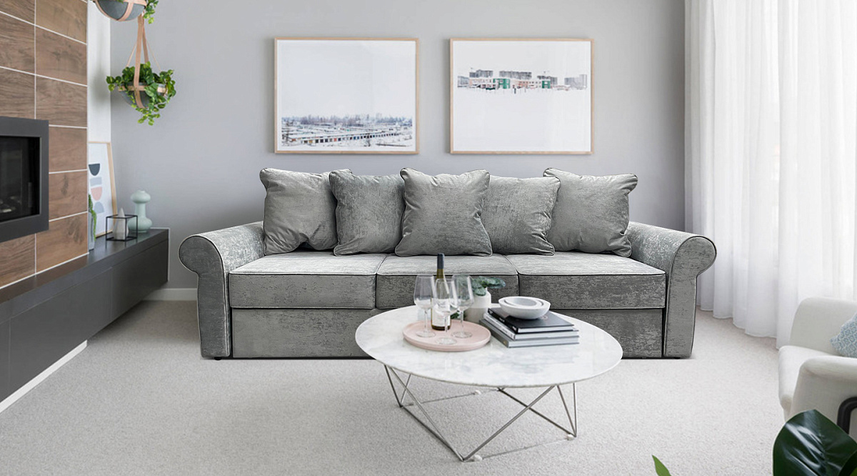 Модель представлена в нейтральный серых оттенках и ярких цветочных узорах на бежевом фоне. Диван отлично подойдет и для зонирования комнаты, и для нейтральных простых интерьеров. Он всегда будет в центре внимания.
