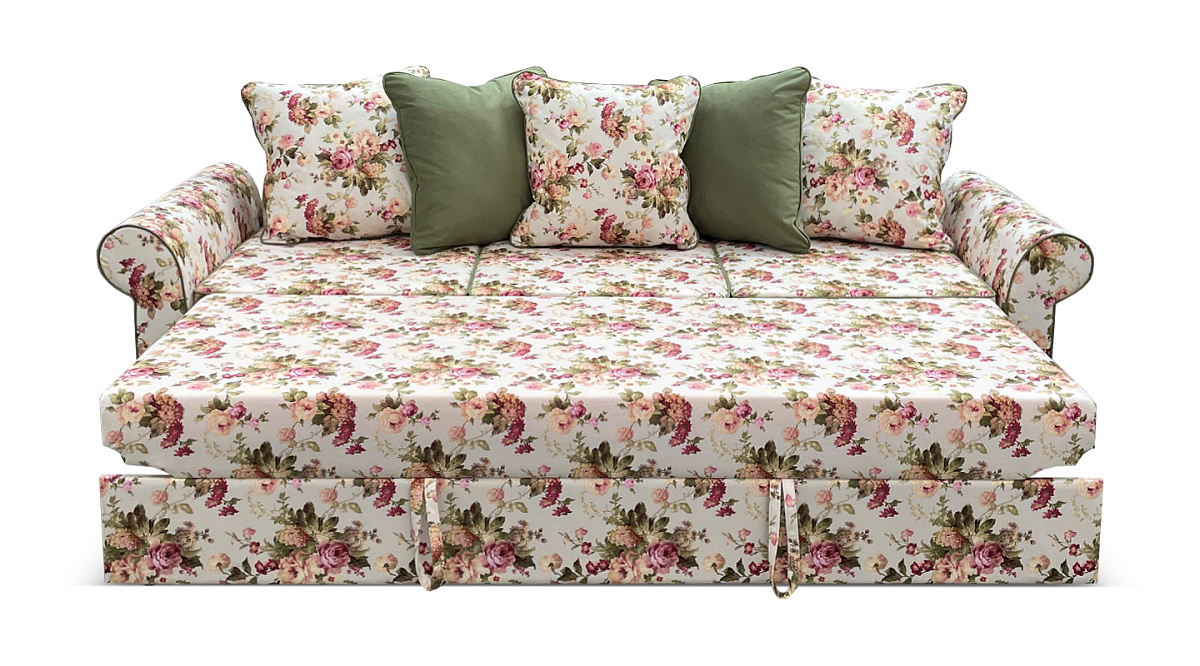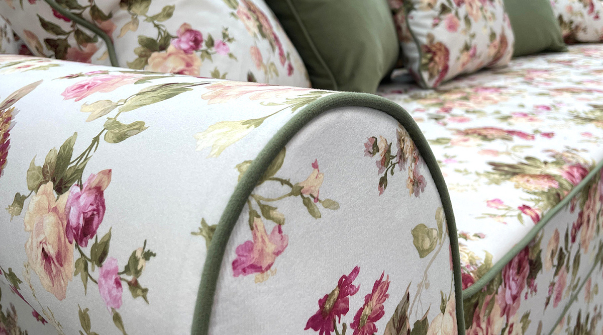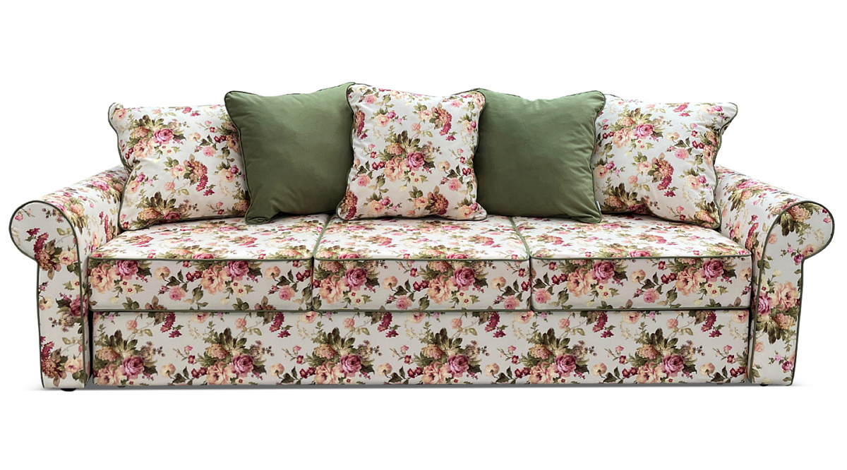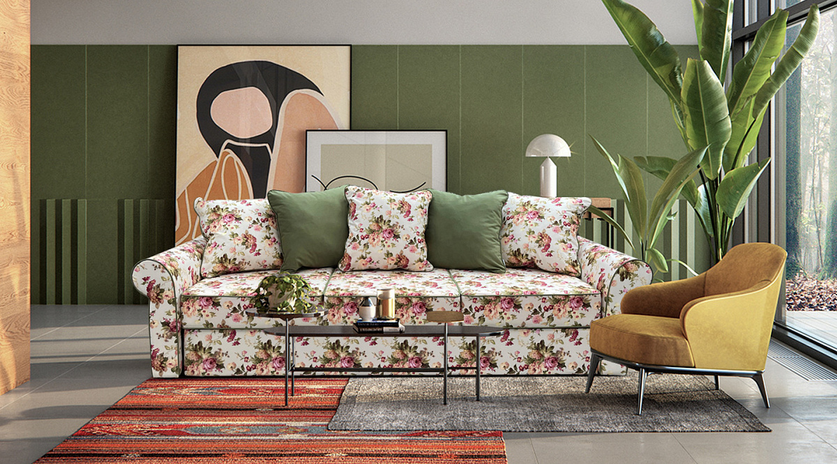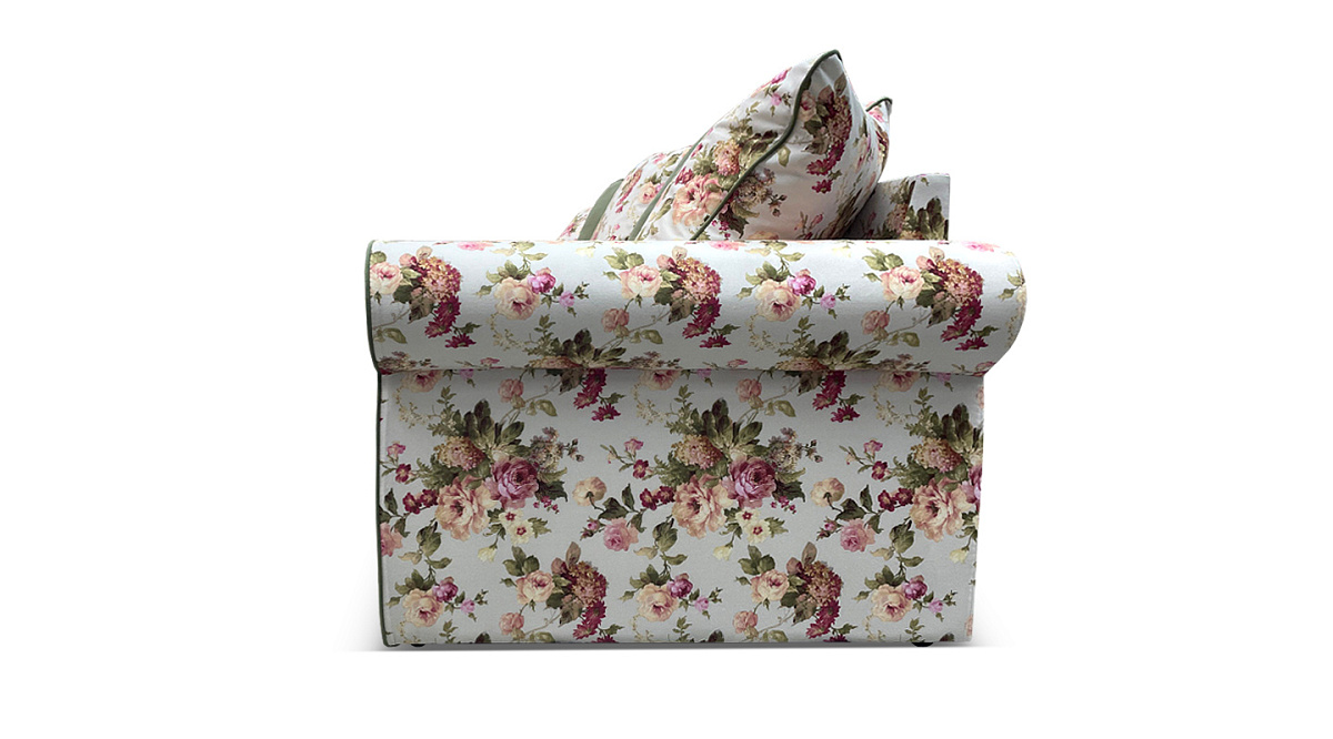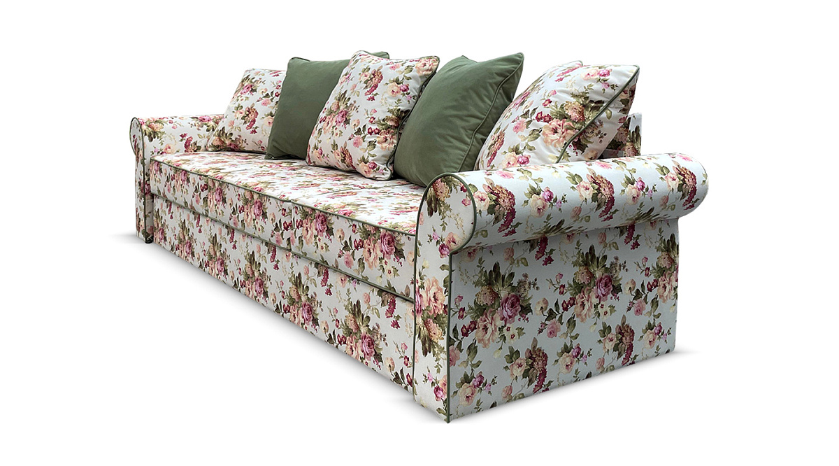 Модель представлена в нейтральный серых оттенках и ярких цветочных узорах на бежевом фоне. Диван отлично подойдет и для зонирования комнаты, и для нейтральных простых интерьеров. Он всегда будет в центре внимания.