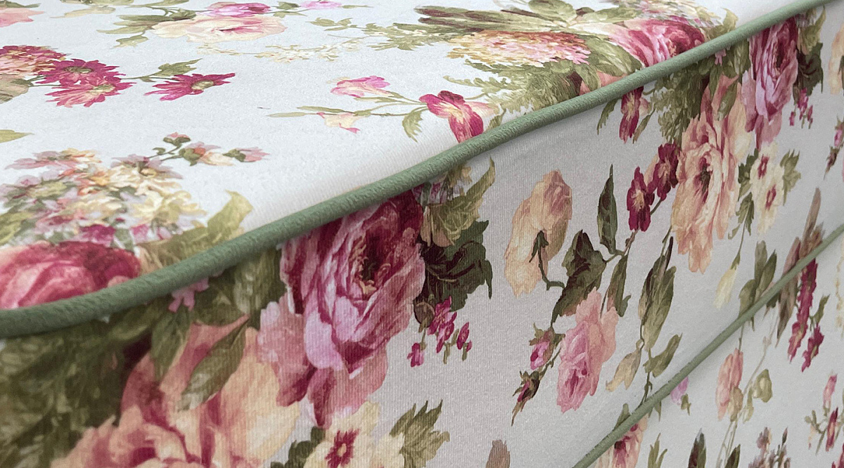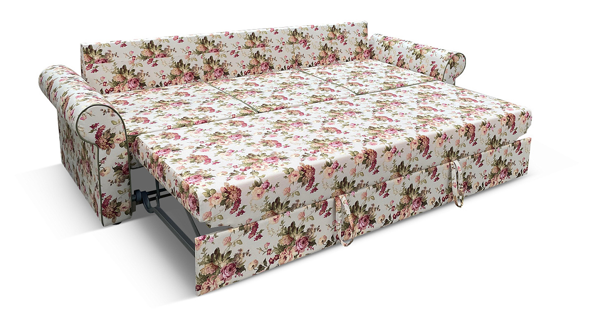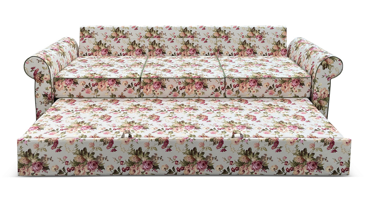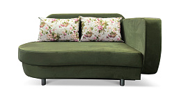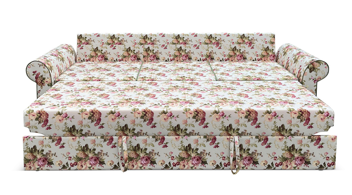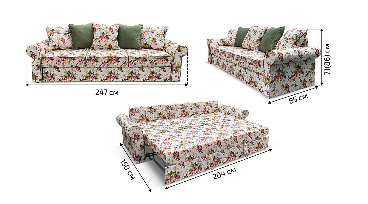 Модель представлена в нейтральный серых оттенках и ярких цветочных узорах на бежевом фоне. Диван отлично подойдет и для зонирования комнаты, и для нейтральных простых интерьеров. Он всегда будет в центре внимания.