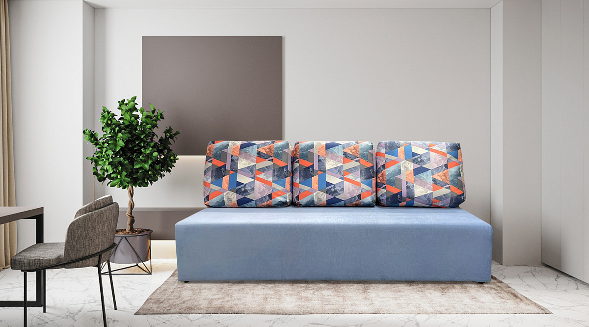 Диван удобен тем, что его можно поставить вплотную к стене. Подлокотники отсутствуют, а это значит что больше места остается свободным, что идеально для маленьких комнат. Это визуально увеличивает комнату, кроме того на таком диване поместится больше гостей. Сесть на него можно с любой стороны.