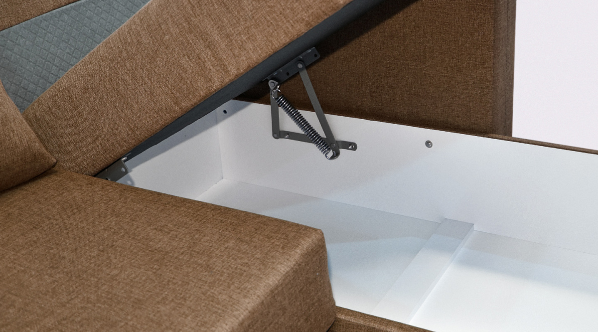 У дивана есть ящик для постельного белья, где можно хранить разные постельные принадлежности, гарантируя им сохранность и защиту от пыли и загрязнений. Короб предназначается для сезонных покрывал, пледов, подушек, постельных комплектов для гостей и членов семьи.