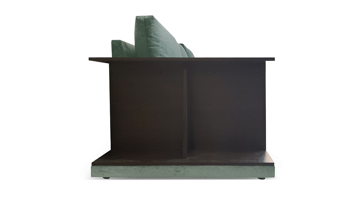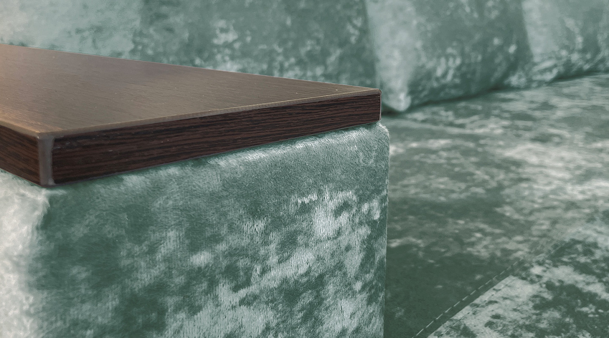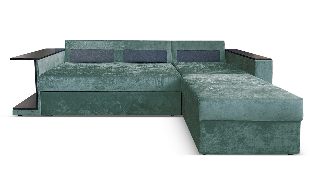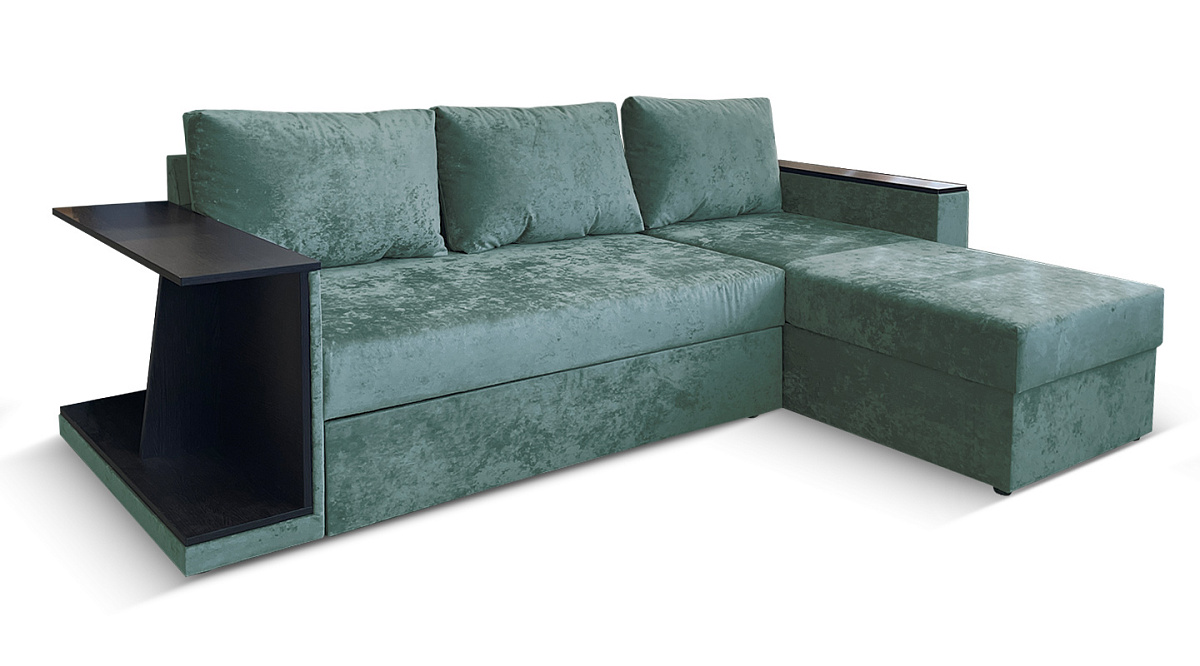 Деревянные вставки на подлокотниках заменят собой кофейный столик. На них можно поставить кружку, положить гаджеты, книги, крема. Сама вставка выполнена из ДСП, а её кромка из ПВХ , что препятствует расслоению и порче материала при его активном использовании и влажной уборке. Ниже расположена полка для книг, сувениров и других предметов.