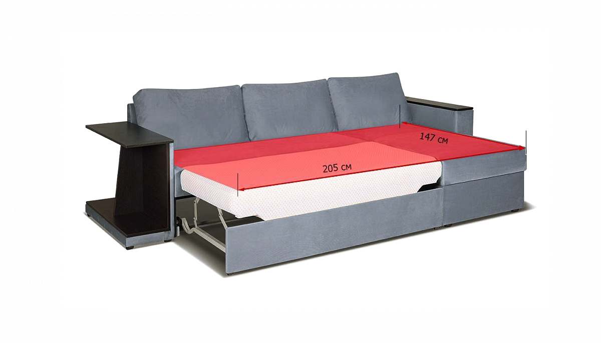 Диван “Берг” раскладывается в полноценную кровать. Это делается с помощью механизма “дельфин”. Спальное место получается просторным и ровным, без ям, перепадов. В основе наполнителя матраса - ППУ высокой плотности и блок независимых пружин.