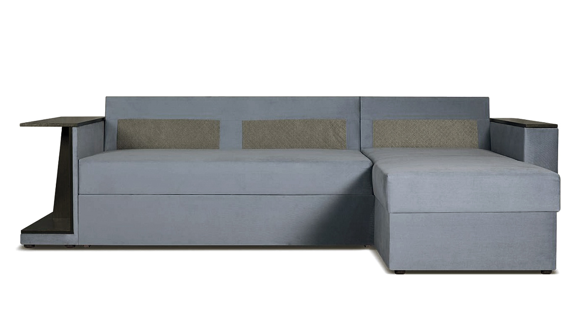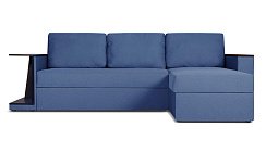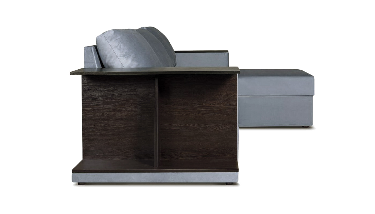 Деревянные вставки на подлокотниках заменят собой кофейный столик. На них можно поставить кружку, положить гаджеты, книги, крема. Сама вставка выполнена из ДСП, а её кромка из ПВХ , что препятствует расслоению и порче материала при его активном использовании и влажной уборке. Ниже расположена полка для книг, сувениров и других предметов.
