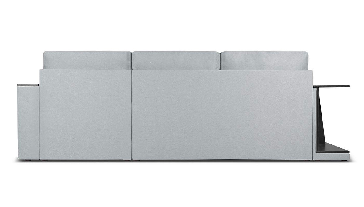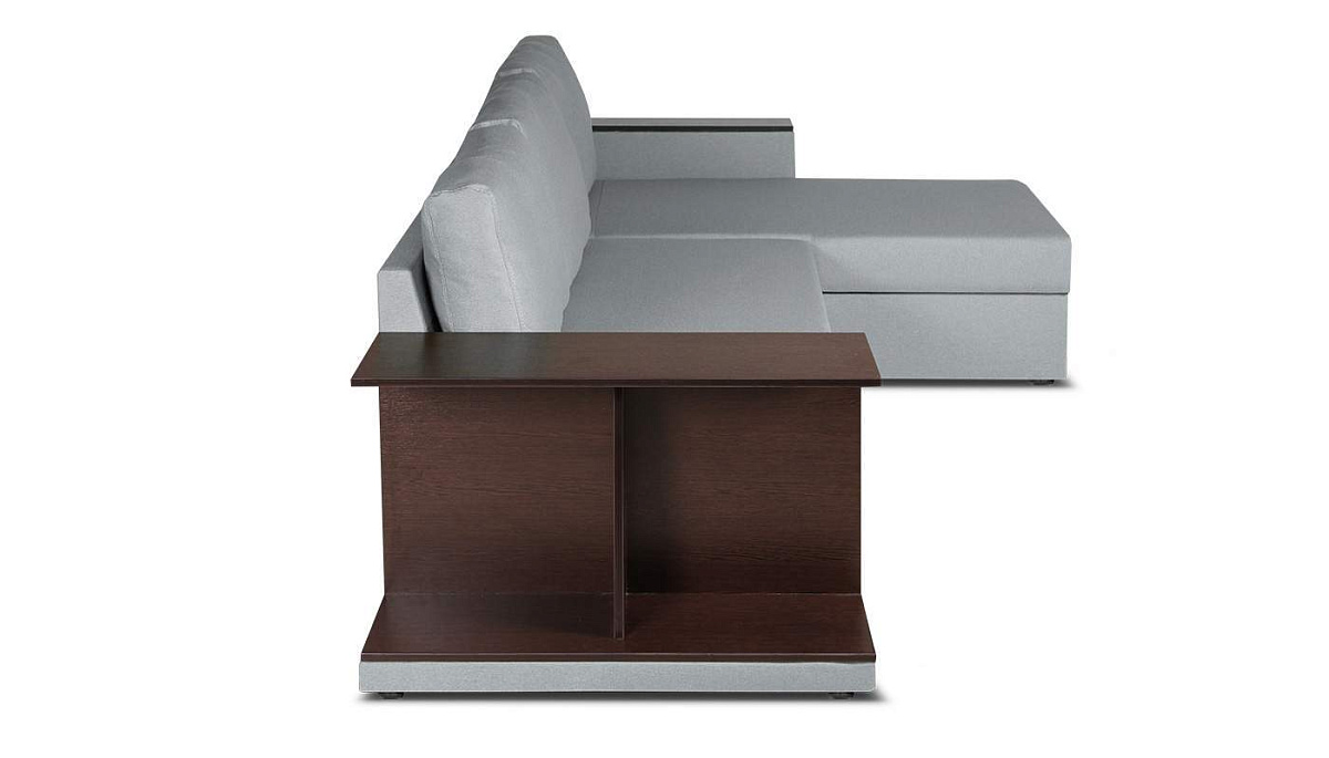 Деревянные вставки на подлокотниках заменят собой кофейный столик. На них можно поставить кружку, положить гаджеты, книги, крема. Сама вставка выполнена из ДСП, а её кромка из ПВХ , что препятствует расслоению и порче материала при его активном использовании и влажной уборке. Ниже расположена полка для книг, сувениров и других предметов.