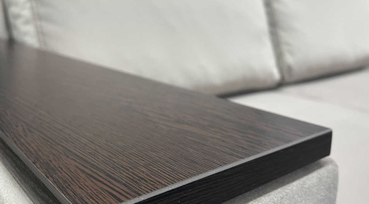 Деревянные накладки на подлокотниках заменят собой кофейный столик. На них можно поставить кружку, положить гаджеты, книги, крема. Сама вставка выполнена из ДСП, а её кромка - из ПВХ. Это препятствует расслоению и порче материала при его активном использовании и влажной уборке. Всё нужное с такими подлокотниками, всегда под рукой. Лишний раз вставать и идти за этими вещами не надо. Можно расслабиться.
