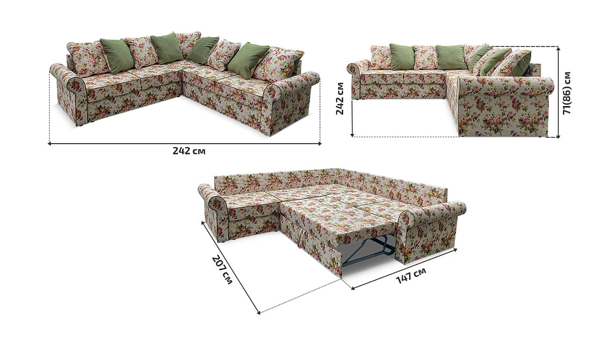 Ткань обивки, несмотря на светлую гамму, не накапливает пыль и при необходимости легко очищается с помощью подручных средств. Благодаря простому складному механизму, диван в стиле прованс быстро и без лишних усилий превращается в просторное спальное место. Качественное наполнение в виде блока независимых пружин обеспечивает здоровый сон с пользой для позвоночника.