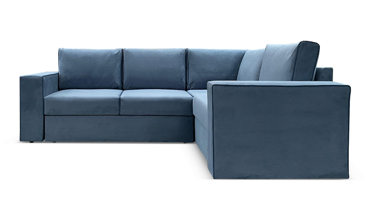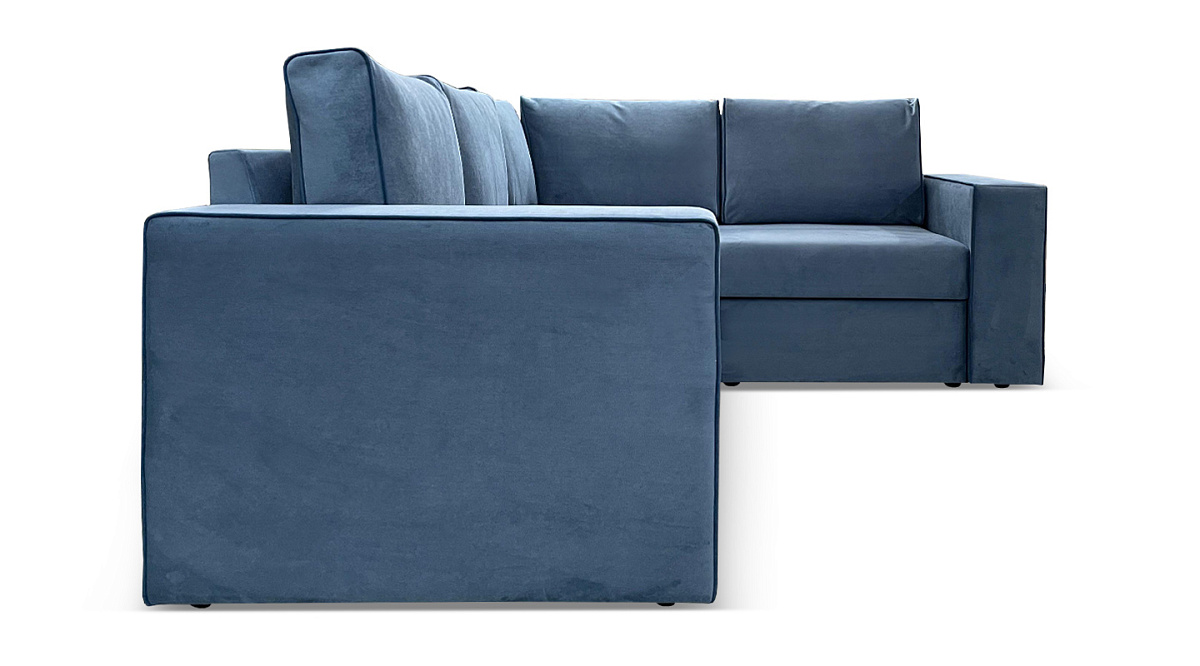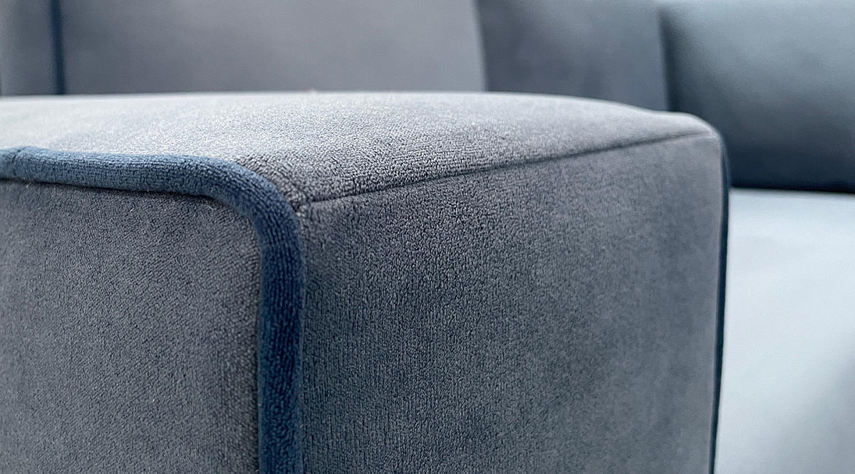 Обивка - благородный бархатистый велюр с контрастным узким кантом. Окантовка удачно подчеркивает графичность модели, визуально прорисовывая силуэт дивана.