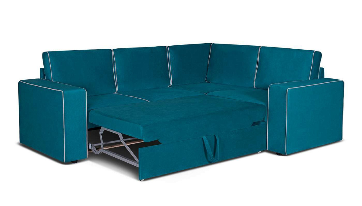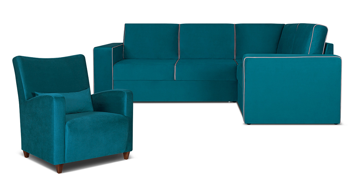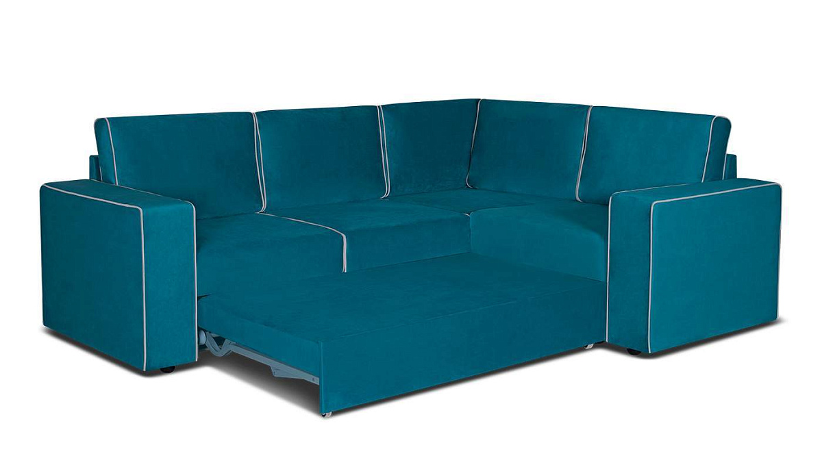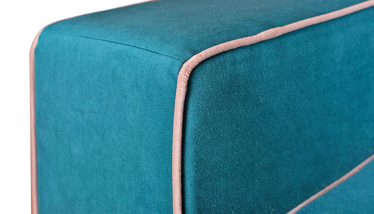 Обивка - благородный бархатистый велюр с контрастным узким кантом. Окантовка удачно подчеркивает графичность модели, визуально прорисовывая силуэт дивана.